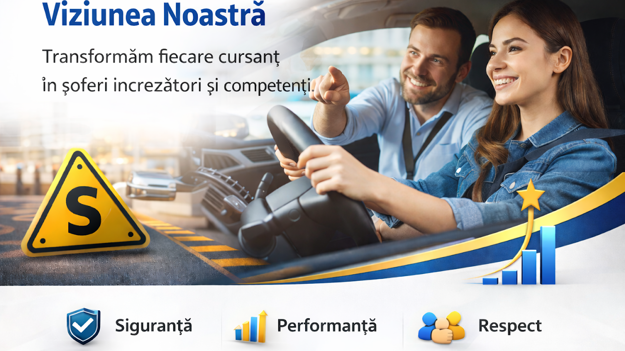 Viziunea noastră este să fim o școală auto de referință, recunoscută pentru excelență în formarea șoferilor competenți, responsabili și bine pregătiți, prin standarde ridicate de calitate, profesionalism și educație rutieră continuă.